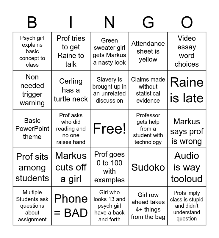 This bingo card has a free space and 24 words: Markus cuts off a girl, Phone = BAD, Slavery is brought up in an unrelated discussion, Multiple Students ask questions about assignment, Video essay word choices, Psych girl explains basic concept to class, Non needed trigger warning, Prof tries to get Raine to talk, Professor gets help from a student with technology, Prof goes 0 to 100 with examples, Claims made without statistical evidence, Basic PowerPoint theme, Sudoko, Audio is way tooloud, Cerling has a turtle neck, Girl row ahead takes 4+ things from the bag, Markus says prof is wrong, Green sweater girl gets Markus a nasty look, Raine is late, Prof asks who did reading and no one raises hand, Profs imply class is stupid and didn’t understand question, Prof sits among students, Attendance sheet is yellow and Girl who looks 13 and psych girl have a back and forth.