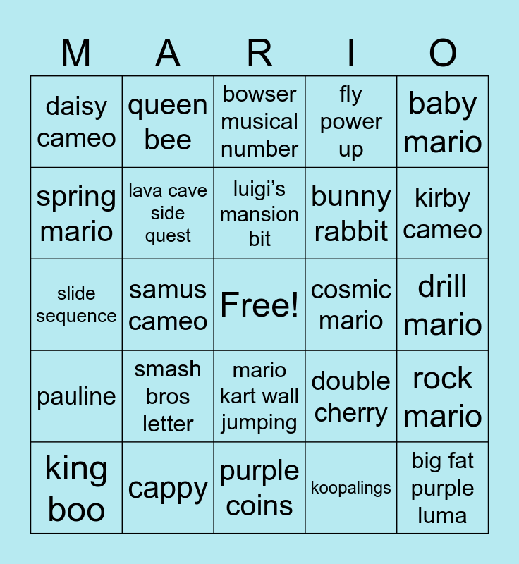 This bingo card has a free space and 24 words: smash bros letter, cappy, luigi’s mansion bit, king boo, baby mario, daisy cameo, spring mario, queen bee, cosmic mario, mario kart wall jumping, bunny rabbit, slide sequence, double cherry, rock mario, lava cave side quest, koopalings, drill mario, bowser musical number, kirby cameo, samus cameo, big fat purple luma, pauline, fly power up and purple coins.