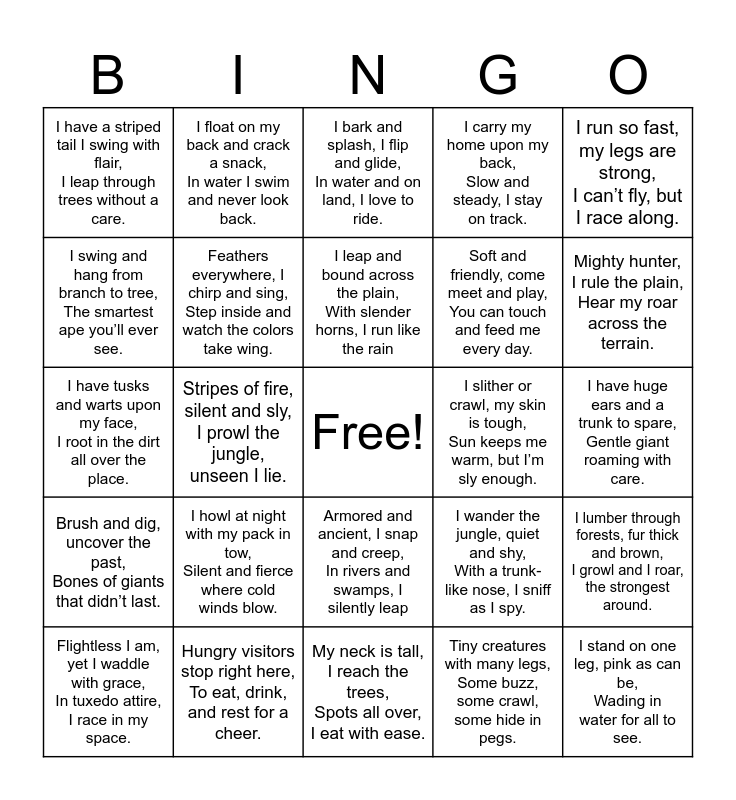 This bingo card has a free space and 29 words: Flightless I am, yet I waddle with grace, In tuxedo attire, I race in my space., I sport sharp a point upon my head, I roam the wild or fields I tread., Stripes of fire, silent and sly, I prowl the jungle, unseen I lie., I hop all day and carry my young, In Australia’s sun, my jumps are long., I have a striped tail I swing with flair, I leap through trees without a care., I bark and splash, I flip and glide, In water and on land, I love to ride., Feathers everywhere, I chirp and sing, Step inside and watch the colors take wing., I howl at night with my pack in tow, Silent and fierce where cold winds blow., I slither or crawl, my skin is tough, Sun keeps me warm, but I’m sly enough., Hungry visitors stop right here, To eat, drink, and rest for a cheer., I have huge ears and a trunk to spare, Gentle giant roaming with care., I stand on one leg, pink as can be, Wading in water for all to see., My neck is tall, I reach the trees, Spots all over, I eat with ease., Tiny creatures with many legs, Some buzz, some crawl, some hide in pegs., Mighty hunter, I rule the plain, Hear my roar across the terrain., Smooth and flat, I glide in the bay, Reach out your hand and feel me play., Armored and ancient, I snap and creep, In rivers and swamps, I silently leap, Brush and dig, uncover the past, Bones of giants that didn’t last., I run so fast, my legs are strong, I can’t fly, but I race along., I have tusks and warts upon my face, I root in the dirt all over the place., I wander the jungle, quiet and shy, With a trunk-like nose, I sniff as I spy., I stand on guard, alert and small, In sandy burrows, I watch it all., Soft and friendly, come meet and play, You can touch and feed me every day., I swing and hang from branch to tree, The smartest ape you’ll ever see., I carry my home upon my back, Slow and steady, I stay on track., I float on my back and crack a snack, In water I swim and never look back., I lumber through forests, fur thick and brown, I growl and I roar, the strongest around., I leap and bound across the plain, With slender horns, I run like the rain and Spots like dots, I run so fast, The quickest in the land, none can surpass..
