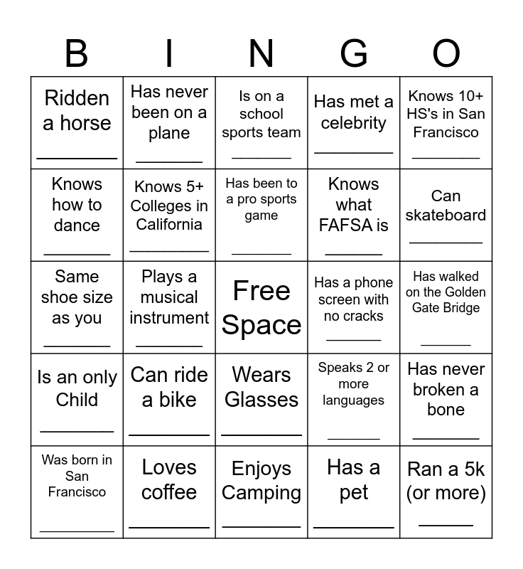 This bingo card has a free space and 32 words: Has a pet _______, Has a younger sibling ________, Plays a musical instrument _______, Has a Dog _______, Is an only Child _______, Knows 5+ Colleges in California _________, Knows 10+ HS's in San Francisco ________, Has never broken a bone _______, Has never been on a plane _______, Can do a cartwheel _______, Has been to a pro sports game ________, Is on a school sports team _______, Has a birthday this summer ________, Can whistle _______, Has a phone screen with no cracks _______, Was born outside of California ________, Was born in San Francisco __________, Same shoe size as you _______, Wears Glasses _______, Can ride a bike _______, Speaks 2 or more languages _______, Plays basketball _______, Has walked on the Golden Gate Bridge _______, Loves coffee _______, Ran a 5k (or more) _____, Has met a celebrity ________, Knows what FAFSA is ______, Knows how to dance _______, Ridden a horse _______, Enjoys Camping _______, Has a nickname _______ and Can skateboard ________.