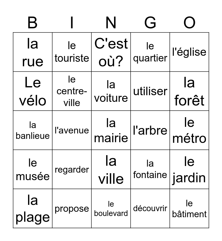 This bingo card has a free space and 24 words: regarder, propose, la voiture, la plage, l'église, la rue, Le vélo, le touriste, l'arbre, la ville, utiliser, la banlieue, la fontaine, le jardin, le centre-ville, découvrir, le métro, C'est où?, la forêt, l'avenue, le bâtiment, le musée, le quartier and le boulevard.