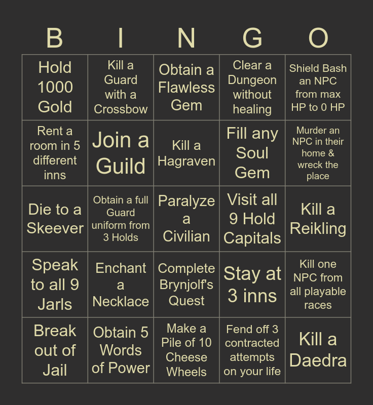 This bingo card has 60 words: Obtain a Dragon Claw, Obtain 5 Words of Power, Sell Skooma, Visit all 9 Hold Capitals, Complete a Quest, Meet both General Tullius & Ulfric Stormcloak, Join a Guild, Clear three Dungeons, Clear a Dungeon without healing, Win a Brawl, Rent a room in 5 different inns, Kill Grelod the Kind, Kill a Hagraven, Read 5 Skill Books, Learn 5 new Spells, Hold 1000 Gold, Obtain a full Guard uniform from 3 Holds, Obtain a Flawless Gem, Bankrupt a Merchant, Murder an NPC in their home & wreck the place, Die to a Skeever, Kill a Guard with a Crossbow, Make a Pile of 10 Cheese Wheels, Stay at 3 inns, 10,000 Total Bounty, Obtain a Follower, Punch a Jarl, Reach Level 10, Fill any Soul Gem, Interrupt Rogvir's Execution & Escape, Get Married, Steal A Dibella Statue, Killcam a Deer w/ an elemental arrow, Feed as a Vampire, Shield Bash an NPC from max HP to 0 HP, Break out of Jail, Pickpocket an Enchanted Ring, Paralyze a Civilian, Kill a Frost Troll, Kill a Reikling, Spend EXACTLY 1000 gold in one shopping trip, Enchant a Necklace, Complete Brynjolf's Quest, Enter a Player Home, Kill a Daedra, Kill an enemy using a trap, Loot a Unique Item, Pray to Every Divine, Shoplift 200 gold value from 5 Separate Shops and get away with it, Kill one NPC from all playable races, Speak to all 9 Jarls, Donate to all 11 Beggars, Free a Prisoner from Capture, Contract all 9 contractible diseases, Sell a farmer all their own crops, Meet a Ghost, Kill a Giant and take it's toe, Perform a Kill with each of the 9 weapon types, Fend off 3 contracted attempts on your life and Learn one min. Apprentice Lvl Spell from all 5 schools.
