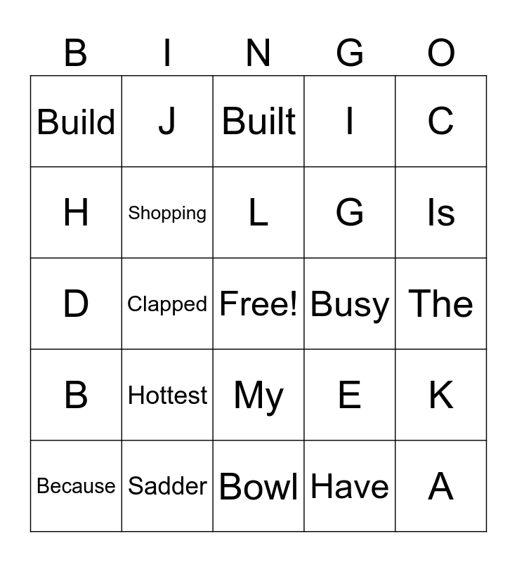 This bingo card has a free space and 29 words: Because, Sitting, Clapped, Bigger, Build, Built, Shopping, Hottest, Busy, Sadder, The, A, Bowl, Have, Is, That, My, B, C, D, E, F, G, H, I, J, K, L and M.