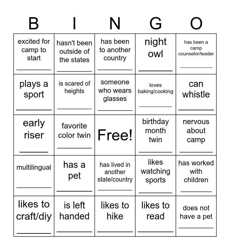 This bingo card has a free space and 24 words: has a pet _______, is left handed _______, someone who wears glasses _________, likes to craft/diy ______, has been a camp counselor/leader ____________, excited for camp to start _________, plays a sport _______, hasn't been outside of the states _________, birthday month twin ________, has lived in another state/country __________, loves baking/cooking ___________, early riser _____, likes watching sports ________, has worked with children ________, is scared of heights __________, likes to read _______, nervous about camp ________, has been to another country _________, can whistle _______, favorite color twin ________, does not have a pet _________, multilingual _________, night owl ______ and likes to hike _______.