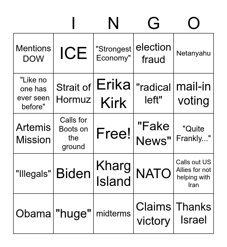 This bingo card has a free space and 24 words: Obama, Biden, Erika Kirk, Claims victory, Netanyahu, Mentions DOW, ICE, "Strongest Economy", "Fake News", "Quite Frankly...", Artemis Mission, Strait of Hormuz, NATO, Calls out US Allies for not helping with Iran, "Like no one has ever seen before", "huge", midterms, election fraud, mail-in voting, "Illegals", Calls for Boots on the ground, Kharg Island, "radical left" and Thanks Israel.