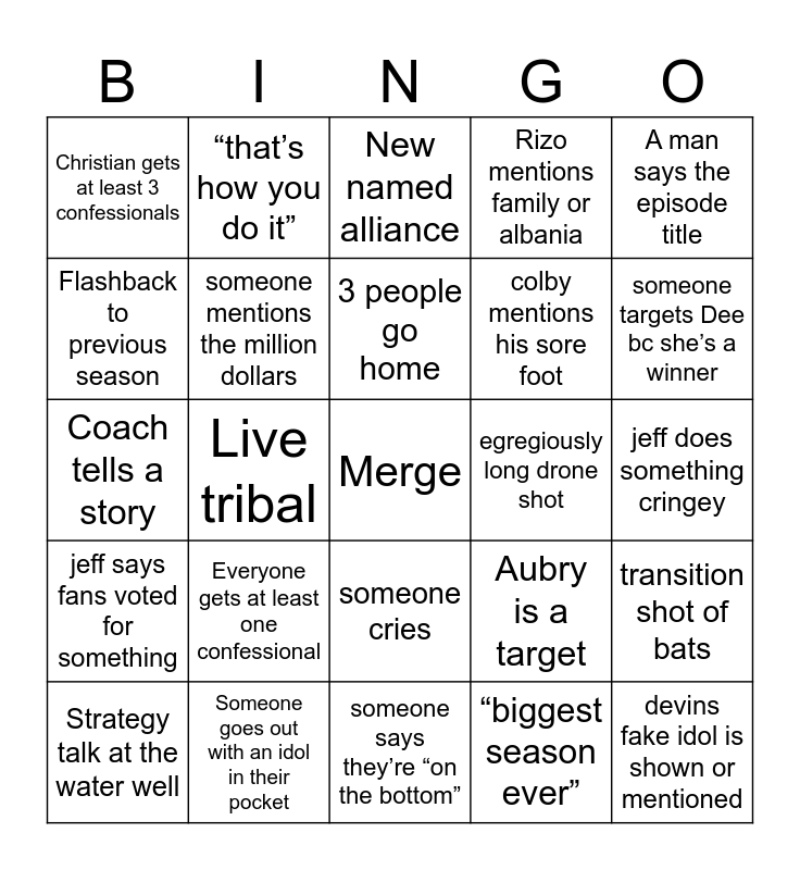 This bingo card has a free space and 24 words: Everyone gets at least one confessional, Someone goes out with an idol in their pocket, 3 people go home, Strategy talk at the water well, A man says the episode title, Christian gets at least 3 confessionals, Flashback to previous season, “that’s how you do it”, egregiously long drone shot, someone cries, colby mentions his sore foot, Coach tells a story, Aubry is a target, transition shot of bats, someone mentions the million dollars, “biggest season ever”, jeff does something cringey, New named alliance, someone targets Dee bc she’s a winner, Live tribal, devins fake idol is shown or mentioned, jeff says fans voted for something, Rizo mentions family or albania and someone says they’re “on the bottom”.