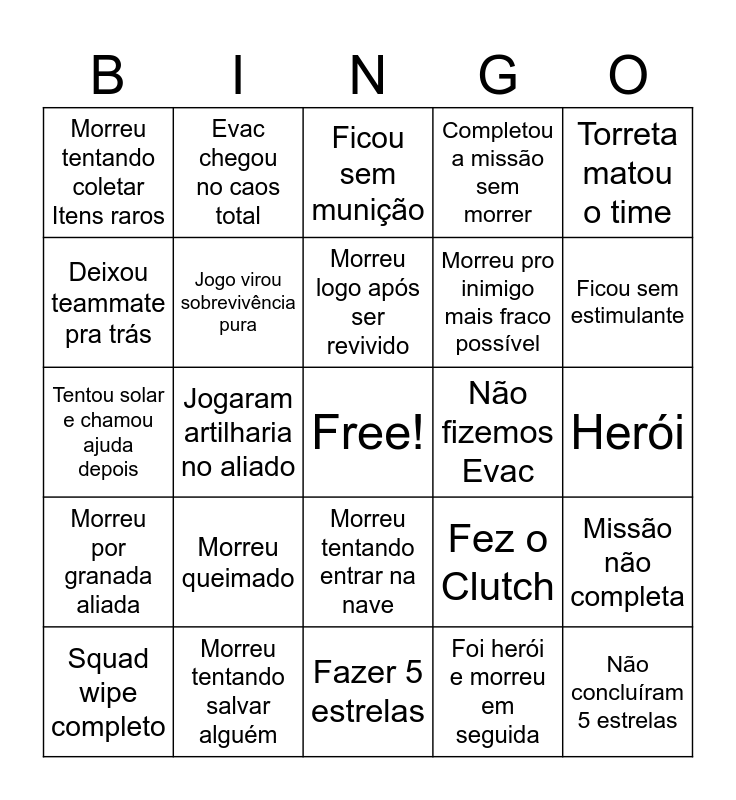 This bingo card has a free space and 24 words: Morreu queimado, Morreu tentando salvar alguém, Morreu logo após ser revivido, Squad wipe completo, Torreta matou o time, Morreu tentando coletar Itens raros, Deixou teammate pra trás, Evac chegou no caos total, Não fizemos Evac, Morreu tentando entrar na nave, Morreu pro inimigo mais fraco possível, Tentou solar e chamou ajuda depois, Fez o Clutch, Missão não completa, Jogo virou sobrevivência pura, Foi herói e morreu em seguida, Herói, Ficou sem munição, Ficou sem estimulante, Jogaram artilharia no aliado, Não concluíram 5 estrelas, Morreu por granada aliada, Completou a missão sem morrer and Fazer 5 estrelas.