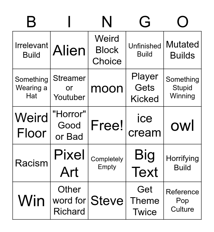 This bingo card has a free space and 31 words: Steve, Just a Regular House, "Horror" Good or Bad, Non Related Build, Irrelevant Build, Weird Block Choice, Streamer or Youtuber, Big Text, ice cream, Get Theme Twice, owl, Reference Pop Culture, Entirely Wood, Gigantic Huge im mean just unbelievably big Cheeks, Something Stupid Winning, Build Turned into a House, Horrifying Build, Pixel Art, Racism, Completely Empty, Mutated Builds, Random Blocks Everywhere, Win, Alien, Player Gets Kicked, Something Wearing a Hat, Unfinished Build, Weird Floor, Other word for Richard, moon and Computer Theme Selected.