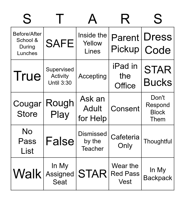 This bingo card has 29 words: Walk, Sit, Rough Play, In My Backpack, Before/After School & During Lunches, Inside the Yellow Lines, Supervised Activity Until 3:30, False, Consent, In My Assigned Seat, Don't Respond Block Them, Ask an Adult for Help, STAR, Wear the Red Pass Vest, STAR Bucks, Straight There and Straight Back, Dismissed by the Teacher, No Pass List, Dress Code, Cougar Store, Cafeteria Only, Eating Breakfast, iPad in the Office, True, Parent Pickup, SAFE, Thoughtful, Accepting and Responsible.