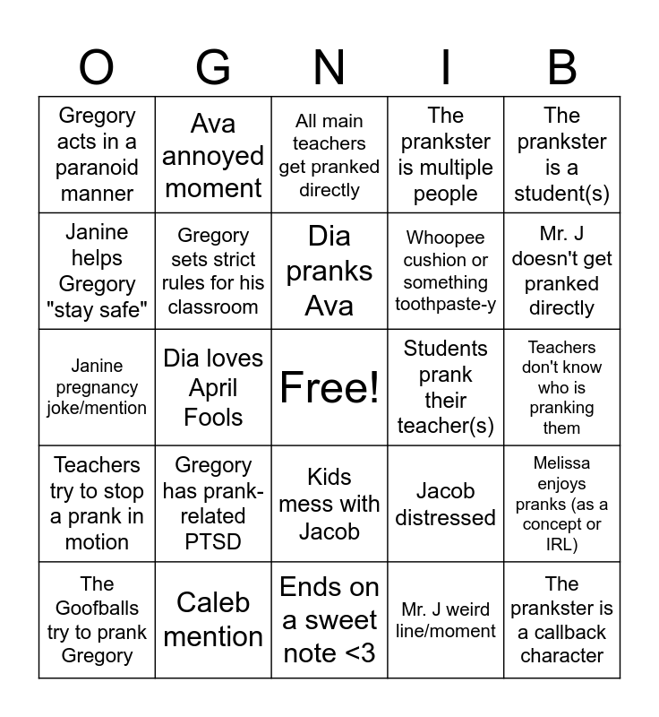This bingo card has a free space and 24 words: Gregory has prank-related PTSD, Caleb mention, Dia pranks Ava, The Goofballs try to prank Gregory, The prankster is a student(s), Gregory acts in a paranoid manner, Janine helps Gregory "stay safe", Ava annoyed moment, Students prank their teacher(s), Kids mess with Jacob, Whoopee cushion or something toothpaste-y, Janine pregnancy joke/mention, Jacob distressed, Melissa enjoys pranks (as a concept or IRL), Gregory sets strict rules for his classroom, Mr. J weird line/moment, Teachers don't know who is pranking them, All main teachers get pranked directly, Mr. J doesn't get pranked directly, Dia loves April Fools, The prankster is a callback character, Teachers try to stop a prank in motion, The prankster is multiple people and Ends on a sweet note <3.