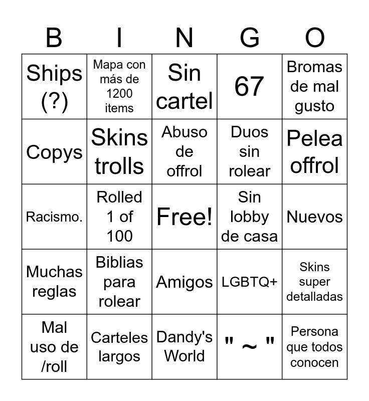 This bingo card has a free space and 24 words: Biblias para rolear, Carteles largos, Abuso de offrol, Mal uso de /roll, Bromas de mal gusto, Ships (?), Copys, Mapa con más de 1200 items, Sin lobby de casa, Amigos, Duos sin rolear, Racismo., LGBTQ+, Skins super detalladas, Skins trolls, " ~ ", Nuevos, Sin cartel, Pelea offrol, Rolled 1 of 100, Persona que todos conocen, Muchas reglas, 67 and Dandy's World.