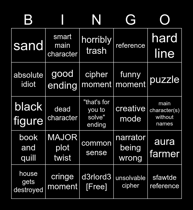 This bingo card has 25 words: book and quill, cringe moment, "that's for you to solve" ending, unsolvable cipher, hard line, sand, smart main character, horribly trash, creative mode, aura farmer, absolute idiot, good ending, d3rlord3 [Free], narrator being wrong, puzzle, house gets destroyed, dead character, cipher moment, funny moment, main character(s) without names, black figure, MAJOR plot twist, common sense, reference and sfawtde reference.