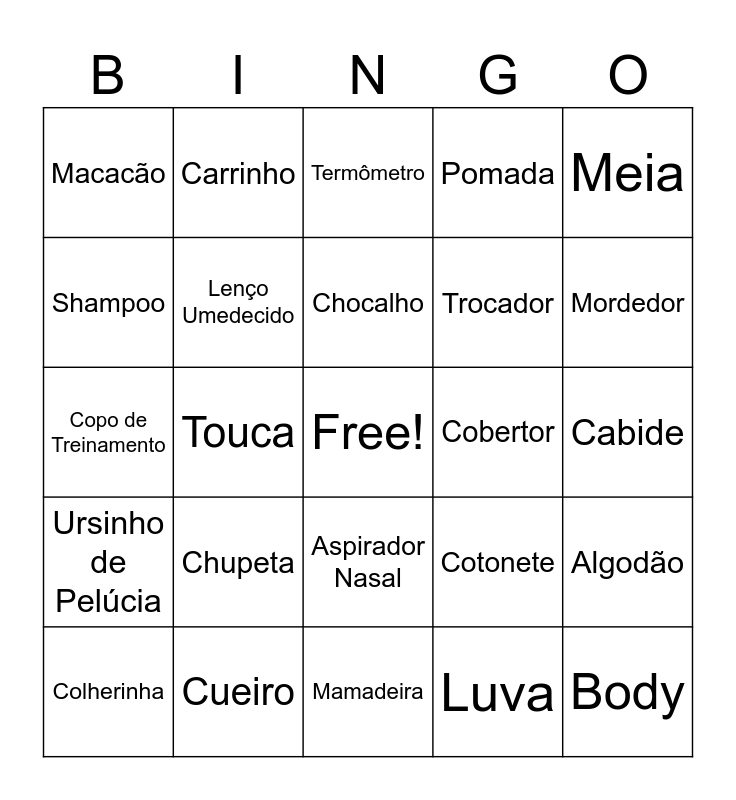This bingo card has a free space and 50 words: Fralda, Body, Sapatinho, Mamadeira, Chupeta, Berço, Carrinho, Banheira, Shampoo, Sabonete, Lenço Umedecido, Pomada, Algodão, Cotonete, Babador, Móbile, Chocalho, Cobertor, Toalha, Meia, Touca, Luva, Macacão, Trocador, Bolsa, Cueiro, Mordedor, Escova de Cabelo, Termômetro, Aspirador Nasal, Babá Eletrônica, Naninha, Almofada de Amamentação, Extrator de Leite, Cueiro, Faixa de Cabelo, Vestidinho, Body de Manga Longa, Calça, Cabide, Cortador de Unha, Talco, Álcool 70%, Pratinho, Colherinha, Copo de Treinamento, Porta Chupeta, Prendedor de Chupeta, Ursinho de Pelúcia and Borboleta.