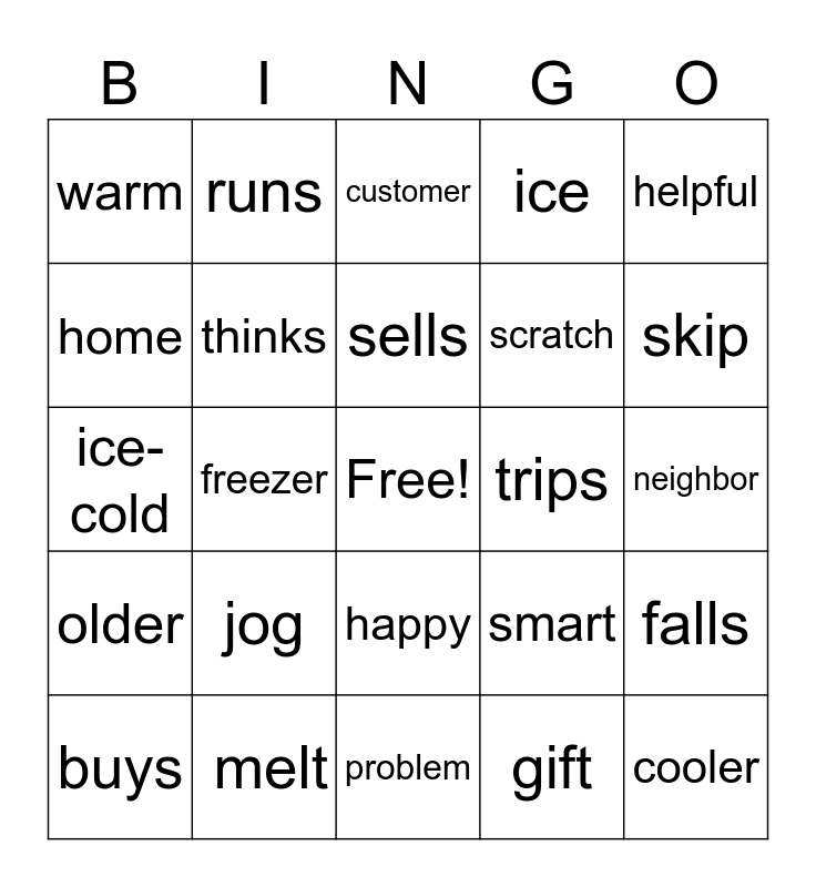 This bingo card has a free space and 24 words: jog, melt, sells, buys, helpful, warm, home, runs, trips, happy, scratch, ice-cold, smart, falls, thinks, gift, neighbor, customer, skip, freezer, cooler, older, ice and problem.