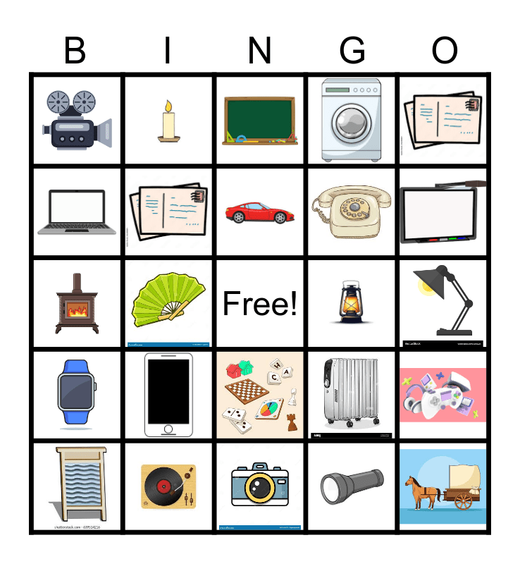 This bingo card has 27 images and a free space.