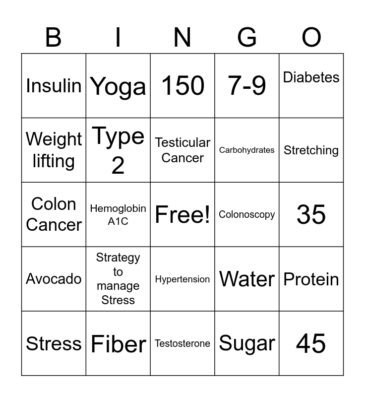 This bingo card has a free space and 24 words: Stress, Strategy to manage Stress, Testicular Cancer, Sugar, Diabetes, Insulin, Yoga, 150, Colonoscopy, 35, Colon Cancer, Type 2, Water, Protein, Weight lifting, Fiber, Testosterone, 7-9, Stretching, Avocado, Hemoglobin A1C, Hypertension, Carbohydrates and 45.