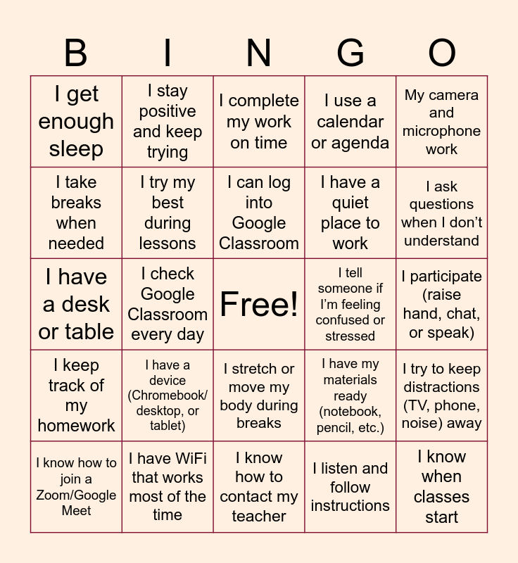 This bingo card has a free space and 24 words: I have a device (Chromebook/ desktop, or tablet), I have WiFi that works most of the time, I can log into Google Classroom, I know how to join a Zoom/Google Meet, My camera and microphone work, I get enough sleep, I take breaks when needed, I stay positive and keep trying, I tell someone if I’m feeling confused or stressed, I stretch or move my body during breaks, I have a quiet place to work, I have a desk or table, I have my materials ready (notebook, pencil, etc.), I try to keep distractions (TV, phone, noise) away, I try my best during lessons, I listen and follow instructions, I participate (raise hand, chat, or speak), I complete my work on time, I ask questions when I don’t understand, I check Google Classroom every day, I know when classes start, I keep track of my homework, I use a calendar or agenda and I know how to contact my teacher.