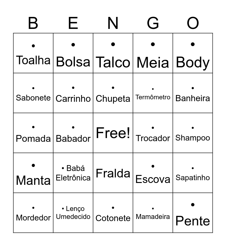 This bingo card has a free space and 26 words: Fralda, • Mamadeira, • Chupeta, • Lenço Umedecido, • Body, • Toalha, • Sabonete, • Bolsa, • Shampoo, • Escova, • Termômetro, • Pomada, • Sapatinho, • Mordedor, • Babador, • Álcool em gel, • Meia, • Manta, • Talco, • Pente, • Banheira, • Cotonete, • Trocador, • Babá Eletrônica, • Carrinho and • leite.