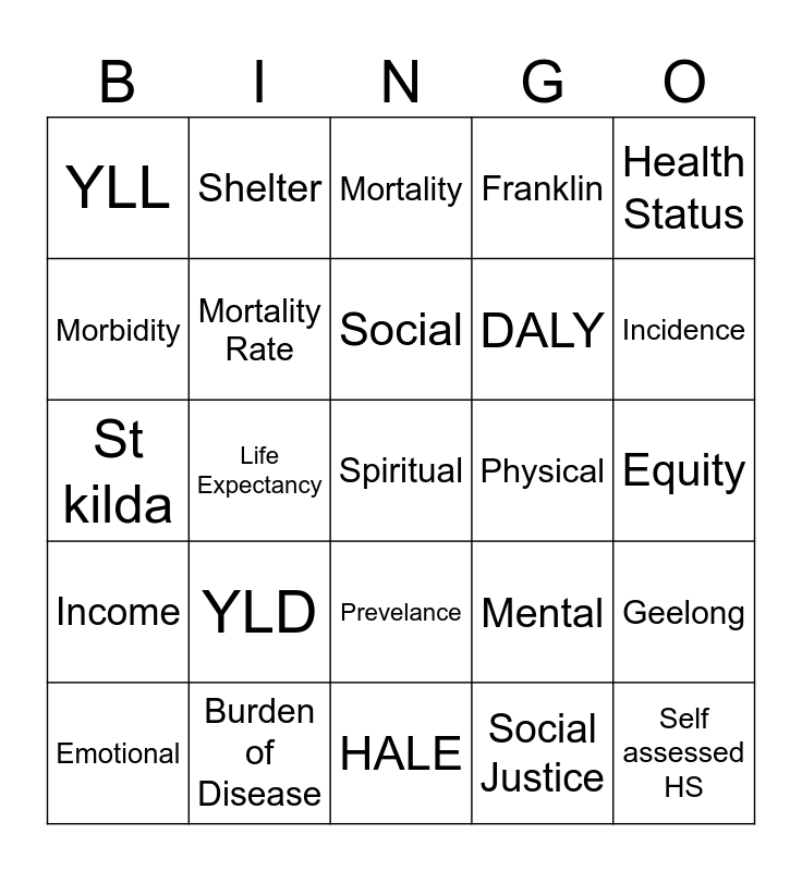 This bingo card has a free space and 24 words: YLD, Burden of Disease, Social, Emotional, Health Status, YLL, Morbidity, Shelter, Physical, Prevelance, DALY, St kilda, Mental, Geelong, Mortality Rate, Social Justice, Equity, Mortality, Incidence, Life Expectancy, Self assessed HS, Income, Franklin and HALE.