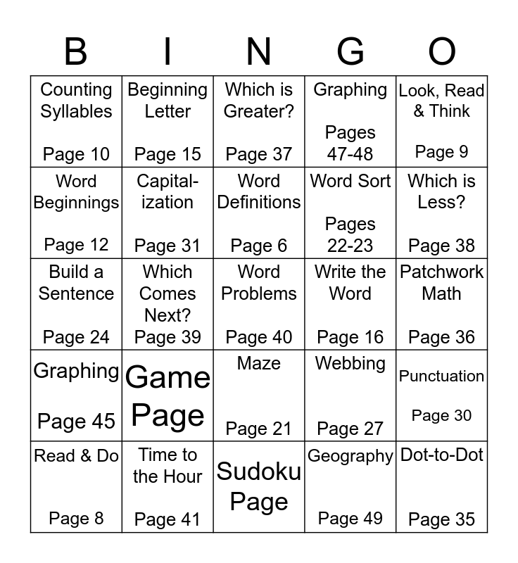 This bingo card has 25 words: Game Page, Sudoku Page, Word Definitions Page 6, Read & Do Page 8, Look, Read & Think Page 9, Counting Syllables Page 10, Word Beginnings Page 12, Beginning Letter Page 15, Write the Word Page 16, Maze Page 21, Word Sort Pages 22-23, Build a Sentence Page 24, Webbing Page 27, Punctuation Page 30, Capital-ization Page 31, Dot-to-Dot Page 35, Patchwork Math Page 36, Which is Greater? Page 37, Which is Less? Page 38, Which Comes Next? Page 39, Word Problems Page 40, Time to the Hour Page 41, Graphing Page 45, Graphing Pages 47-48 and Geography Page 49.