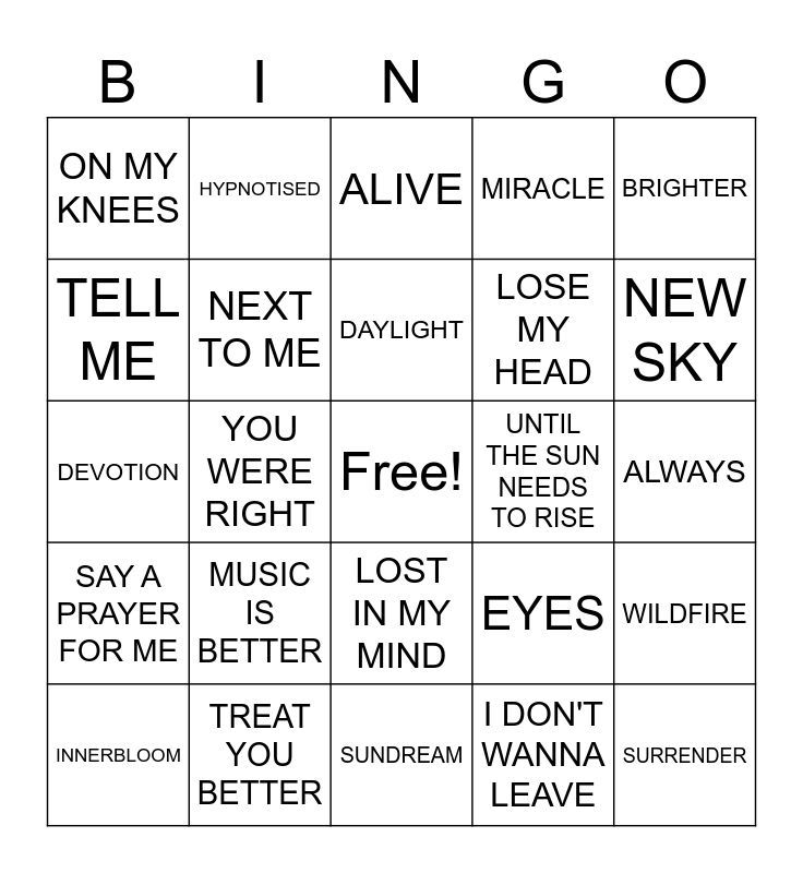 This bingo card has a free space and 29 words: INNERBLOOM, UNDERWATER, YOU WERE RIGHT, NO PLACE, ON MY KNEES, ALIVE, NEXT TO ME, MUSIC IS BETTER, UNTIL THE SUN NEEDS TO RISE, TREAT YOU BETTER, ALWAYS, SURRENDER, SUNDREAM, I DON'T WANNA LEAVE, NEW SKY, LIKE AN ANIMAL, LOST IN MY MIND, SAY A PRAYER FOR ME, BRIGHTER, DEVOTION, EYES, RENDEZVOUS, LOSE MY HEAD, TELL ME, MIRACLE, HYPNOTISED, WILDFIRE, DAYLIGHT and TAKE ME.