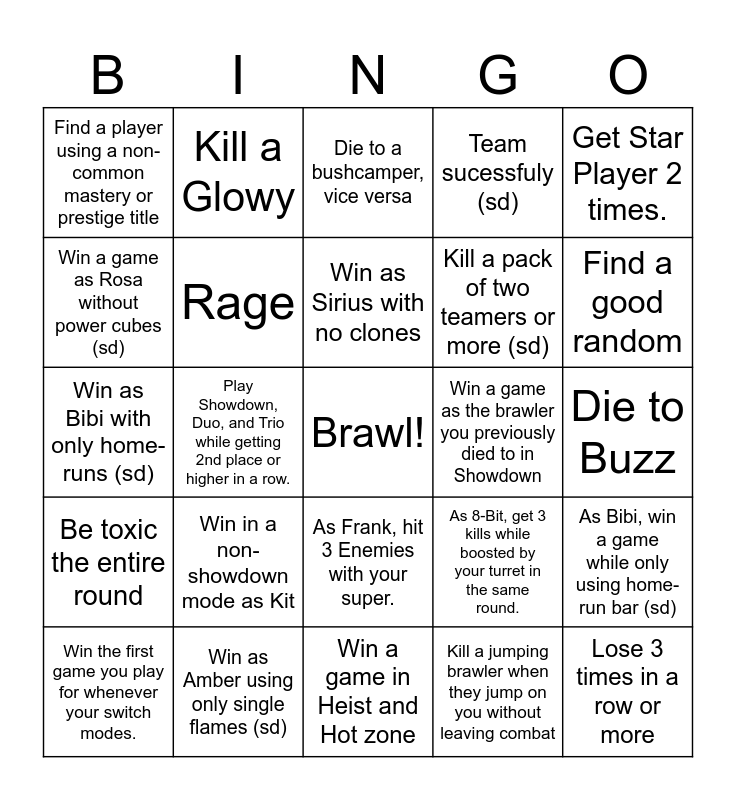 This bingo card has a free space and 24 words: Win in a non-showdown mode as Kit, Win as Amber using only single flames (sd), Win as Sirius with no clones, Win the first game you play for whenever your switch modes., Get Star Player 2 times., Find a player using a non-common mastery or prestige title, Win a game as Rosa without power cubes (sd), Kill a Glowy, Win a game as the brawler you previously died to in Showdown, As Frank, hit 3 Enemies with your super., Kill a pack of two teamers or more (sd), Win as Bibi with only home-runs (sd), As 8-Bit, get 3 kills while boosted by your turret in the same round., As Bibi, win a game while only using home-run bar (sd), Rage, Kill a jumping brawler when they jump on you without leaving combat, Die to Buzz, Die to a bushcamper, vice versa, Find a good random, Play Showdown, Duo, and Trio while getting 2nd place or higher in a row., Lose 3 times in a row or more, Be toxic the entire round, Team sucessfuly (sd) and Win a game in Heist and Hot zone.