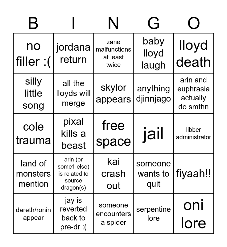 This bingo card has a free space and 24 words: arin (or some1 else) is related to source dragon(s), jay is reverted back to pre-dr :(, skylor appears, dareth/ronin appear, lloyd death, no filler :(, silly little song, jordana return, jail, kai crash out, anything djinnjago, cole trauma, someone wants to quit, fiyaah!!, all the lloyds will merge, serpentine lore, libber administrator, zane malfunctions at least twice, arin and euphrasia actually do smthn, pixal kills a beast, oni lore, land of monsters mention, baby lloyd laugh and someone encounters a spider.