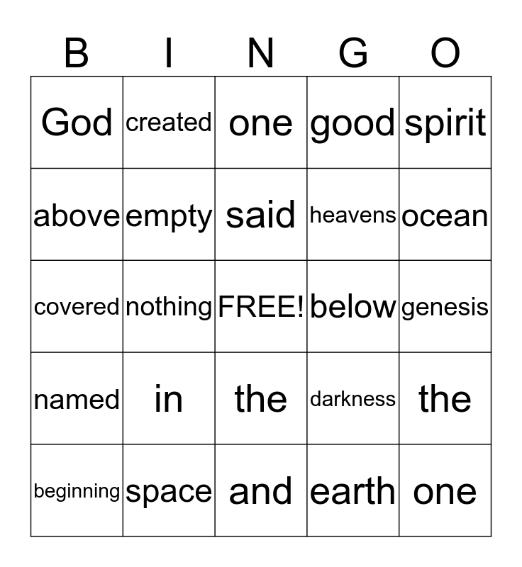 This bingo card has a free space and 24 words: in, space, said, beginning, spirit, God, above, created, below, the, heavens, covered, darkness, the, empty, earth, genesis, one, ocean, nothing, one, named, good and and.