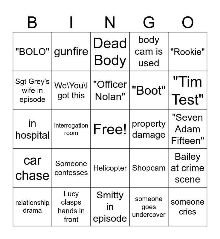 This bingo card has a free space and 27 words: Shopcam, "The Shop", "Boot", Smitty in episode, Sgt Grey's wife in episode, Dead Body, gunfire, car chase, property damage, Bailey at crime scene, in hospital, body cam is used, relationship drama, Lucy clasps hands in front, "Tim Test", personal conversation in front of perp, We\You\I got this, "Officer Nolan", Someone confesses, "BOLO", "Seven Adam Fifteen", someone goes undercover, interrogation room, someone cries, Helicopter, "Rookie" and Fist Fight.