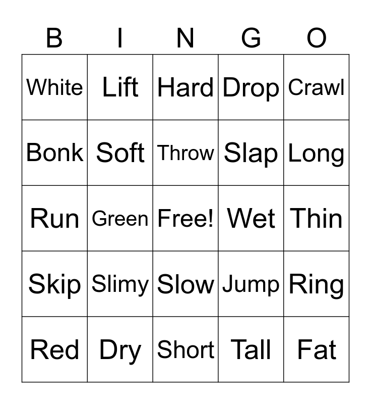 This bingo card has a free space and 29 words: Red, Blue, Green, Black, White, Hard, Soft, Slimy, Wet, Dry, Thin, Fat, Short, Tall, Long, Fast, Slow, Skip, Crawl, Run, Jump, Hit, Slap, Bonk, Drop, Lift, Ring, Throw and Bat.