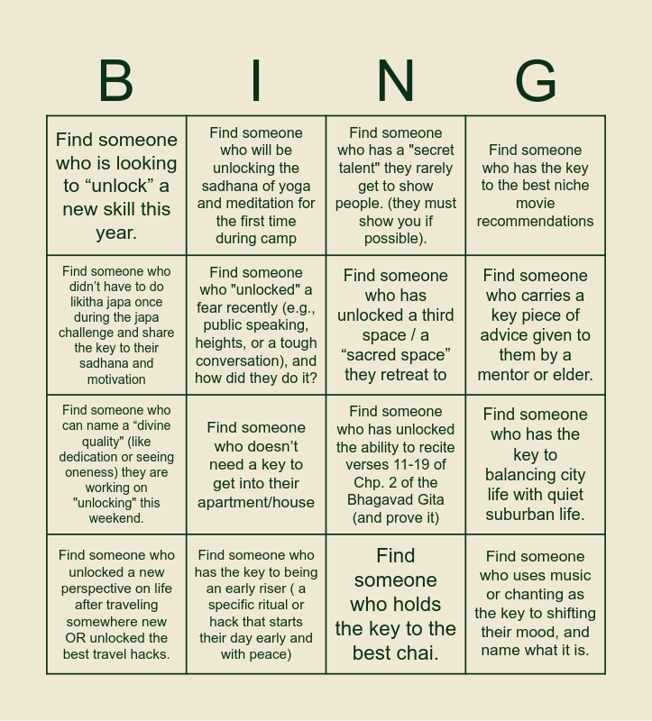 This bingo card has 17 words: Find someone who holds the key to the best chai., Find someone who unlocked a new perspective on life after traveling somewhere new OR unlocked the best travel hacks., Find someone who has a "secret talent" they rarely get to show people. (they must show you if possible)., Find someone who is looking to “unlock” a new skill this year., Find someone who doesn’t need a key to get into their apartment/house, Find someone who has the key to the best niche movie recommendations, Find someone who has the key to balancing city life with quiet suburban life., Find someone who has unlocked a third space / a “sacred space” they retreat to, Find someone who carries a key piece of advice given to them by a mentor or elder., Find someone who "unlocked" a fear recently (e.g., public speaking, heights, or a tough conversation), and how did they do it?, Find someone who has the key to being an early riser ( a specific ritual or hack that starts their day early and with peace), Find someone who has unlocked the ability to recite verses 11-19 of Chp. 2 of the Bhagavad Gita (and prove it), Find someone who didn’t have to do likitha japa once during the japa challenge and share the key to their sadhana and motivation, Find someone who will be unlocking the sadhana of yoga and meditation for the first time during camp, Find someone who can name a “divine quality" (like dedication or seeing oneness) they are working on "unlocking" this weekend., Find someone who has a key memory of a previous Chinmaya Mission camp. and Find someone who uses music or chanting as the key to shifting their mood, and name what it is..