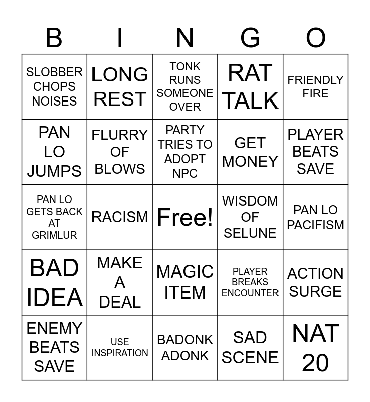 This bingo card has a free space and 49 words: NAT 1, NAT 20, SHORT REST, BADONK ADONK, MAKE A DEAL, FIRE BALL!, LONG REST, ROLL INITIATIVE, PAN LO JUMPS, CARDEN FLIES, FLURRY OF BLOWS, RAT TALK, ACTION SURGE, PLAYER BREAKS ENCOUNTER, TECHNICAL DIFFICULTIES, GRIMLUR SQUASHES, PARTY TRIES TO ADOPT NPC, WISDOM OF SELUNE, "DOES A __ HIT?", FRIENDLY FIRE, RACISM, SAD SCENE, SLOBBER CHOPS NOISES, GET MONEY, PLAYER FAILS SAVE, PLAYER BEATS SAVE, ENEMY BEATS SAVE, ENEMY FAILS SAVE, MAGIC ITEM, BAD IDEA, MUNMIES, mEat?, LAUGH BREAK, SHORT REST, USE INSPIRATION, LEAVE THE CAR BEHIND, CAT TALK, "HELLO FRIEND", PAN LO PACIFISM, MENTION ZARIEL, MENTION ELTUREL, TALK TO THE MAP, SHORT REST, BOSS FIGHT, PAN LO GETS BACK AT GRIMLUR, TONK RUNS SOMEONE OVER, GRIMLUR'S SWARM, ASTRAL ARMS and TALK TO THE SHIELD.