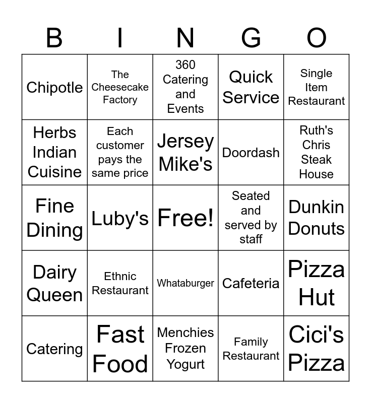 This bingo card has a free space and 24 words: Ethnic Restaurant, Fast Food, Jersey Mike's, Catering, Single Item Restaurant, Chipotle, Herbs Indian Cuisine, The Cheesecake Factory, Seated and served by staff, Whataburger, Doordash, Fine Dining, Cafeteria, Pizza Hut, Each customer pays the same price, Family Restaurant, Dunkin Donuts, 360 Catering and Events, Ruth's Chris Steak House, Luby's, Cici's Pizza, Dairy Queen, Quick Service and Menchies Frozen Yogurt.