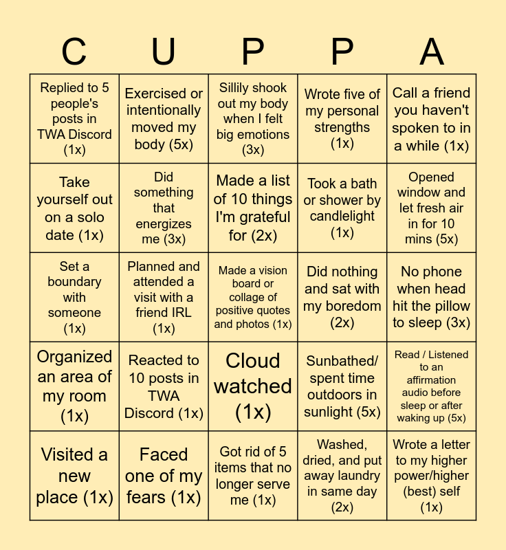 This bingo card has a free space and 24 words: Visited a new place (1x), Reacted to 10 posts in TWA Discord (1x), Made a list of 10 things I'm grateful for (2x), Washed, dried, and put away laundry in same day (2x), Call a friend you haven't spoken to in a while (1x), Replied to 5 people's posts in TWA Discord (1x), Exercised or intentionally moved my body (5x), Sillily shook out my body when I felt big emotions (3x), Did nothing and sat with my boredom (2x), No phone when head hit the pillow to sleep (3x), Set a boundary with someone (1x), Did something that energizes me (3x), Sunbathed/ spent time outdoors in sunlight (5x), Read / Listened to an affirmation audio before sleep or after waking up (5x), Take yourself out on a solo date (1x), Faced one of my fears (1x), Got rid of 5 items that no longer serve me (1x), Wrote five of my personal strengths (1x), Opened window and let fresh air in for 10 mins (5x), Organized an area of my room (1x), Planned and attended a visit with a friend IRL (1x), Cloud watched (1x), Took a bath or shower by candlelight (1x) and Wrote a letter to my higher power/higher (best) self (1x).