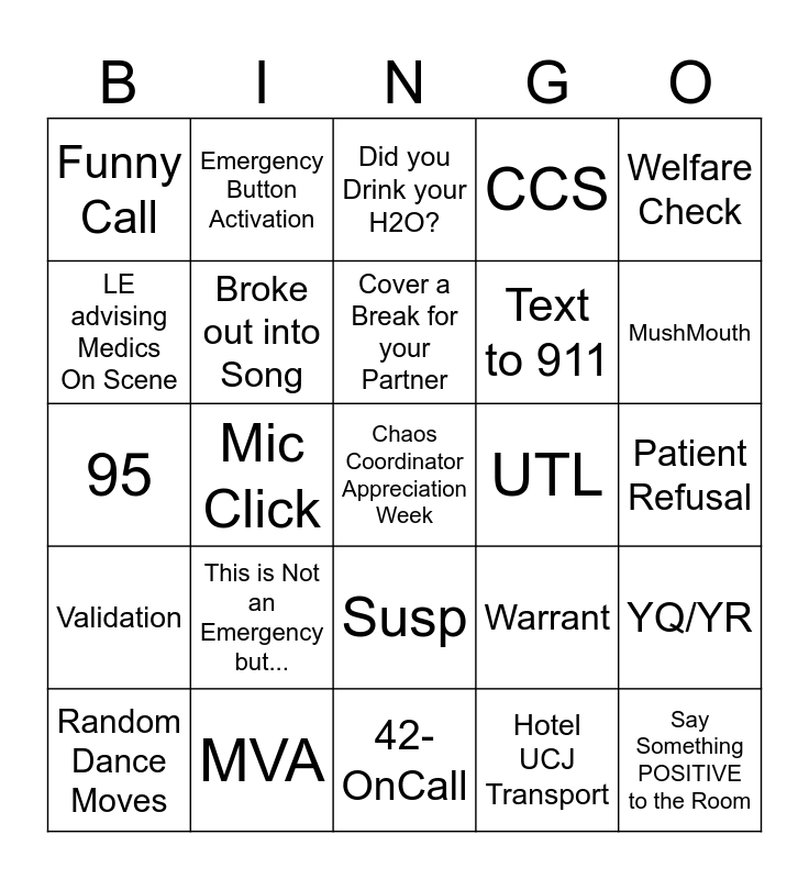 This bingo card has a free space and 29 words: Random Dance Moves, Mental, Mic Click, 10-9, Funny Call, Did you Drink your H2O?, Broke out into Song, This is Not an Emergency but..., UTL, MVA, Patient Refusal, Say Something POSITIVE to the Room, 42-OnCall, Hotel UCJ Transport, MushMouth, Is Today a Burn Day?, Susp, Validation, Welfare Check, 95, Warrant, LifeFlight, Text to 911, LE advising Medics On Scene, CCS, Emergency Button Activation, YQ/YR, Cover a Break for your Partner and 911 Hang up.