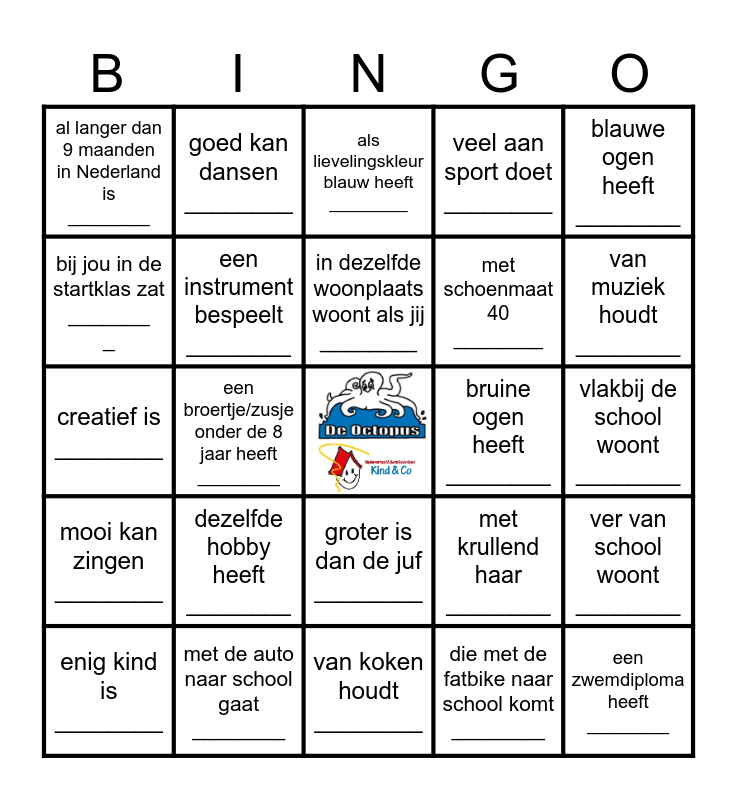 This bingo card has a free space and 24 words: dezelfde hobby heeft ________, met de auto naar school gaat ________, in dezelfde woonplaats woont als jij ________, enig kind is ________, blauwe ogen heeft ________, al langer dan 9 maanden in Nederland is ________, bij jou in de startklas zat _______ _, goed kan dansen ________, bruine ogen heeft ________, groter is dan de juf ________, met schoenmaat 40 ________, creatief is ________, met krullend haar ________, ver van school woont ________, een instrument bespeelt ________, die met de fatbike naar school komt ________, vlakbij de school woont ________, als lievelingskleur blauw heeft ________, van muziek houdt ________, een broertje/zusje onder de 8 jaar heeft ________, een zwemdiploma heeft ________, mooi kan zingen ________, veel aan sport doet ________ and van koken houdt ________.