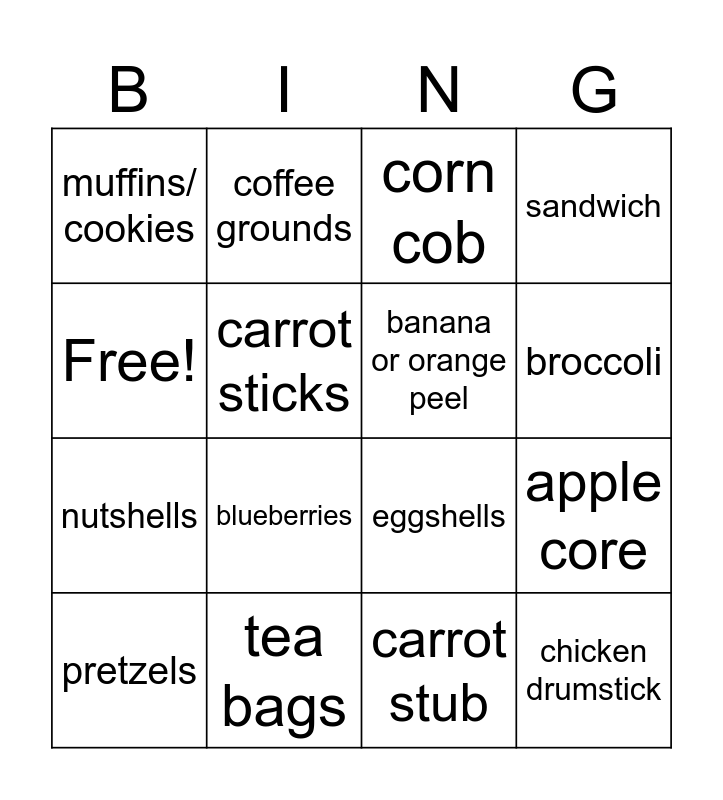 This bingo card has 16 words: tea bags, apple core, corn cob, muffins/ cookies, nutshells, coffee grounds, eggshells, carrot stub, Free!, carrot sticks, pretzels, sandwich, blueberries, broccoli, banana or orange peel and chicken drumstick.
