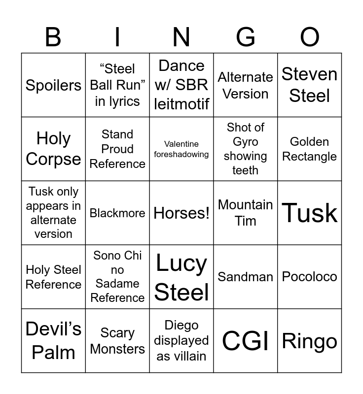 This bingo card has a free space and 24 words: Sono Chi no Sadame Reference, Scary Monsters, Valentine foreshadowing, Devil’s Palm, Steven Steel, Spoilers, Holy Corpse, “Steel Ball Run” in lyrics, Mountain Tim, Lucy Steel, Shot of Gyro showing teeth, Tusk only appears in alternate version, Sandman, Pocoloco, Stand Proud Reference, CGI, Tusk, Dance w/ SBR leitmotif, Golden Rectangle, Blackmore, Ringo, Holy Steel Reference, Alternate Version and Diego displayed as villain.