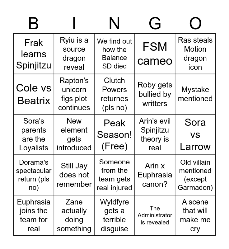This bingo card has a free space and 24 words: Still Jay does not remember, Zane actually doing something, Clutch Powers returnes (pls no), Euphrasia joins the team for real, Ras steals Motion dragon icon, Frak learns Spinjitzu, Cole vs Beatrix, Ryiu is a source dragon reveal, Arin's evil Spinjitzu theory is real, Someone from the team gets real injured, Roby gets bullied by writters, Sora's parents are the Loyalists, Arin x Euphrasia canon?, Old villain mentioned (except Garmadon), Rapton's unicorn figs plot continues, The Administrator is revealed, Sora vs Larrow, We find out how the Balance SD died, Mystake mentioned, New element gets introduced, A scene that will make me cry, Dorama's spectacular return (pls no), FSM cameo and Wyldfyre gets a terrible disguise.