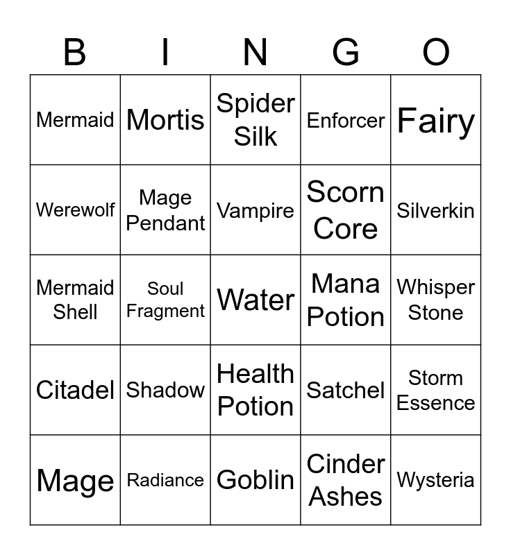 This bingo card has a free space and 24 words: Shadow, Radiance, Vampire, Mage, Fairy, Mermaid, Werewolf, Mortis, Mana Potion, Health Potion, Scorn Core, Mermaid Shell, Satchel, Storm Essence, Mage Pendant, Cinder Ashes, Whisper Stone, Spider Silk, Silverkin, Soul Fragment, Wysteria, Citadel, Enforcer and Goblin.