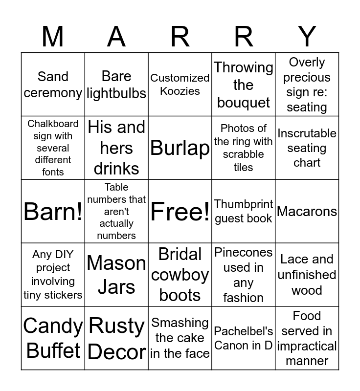 This bingo card has a free space and 24 words: Mason Jars, Rusty Decor, Burlap, Candy Buffet, Overly precious sign re: seating, Sand ceremony, Chalkboard sign with several different fonts, Bare lightbulbs, Thumbprint guest book, Bridal cowboy boots, Photos of the ring with scrabble tiles, Barn!, Pinecones used in any fashion, Lace and unfinished wood, His and hers drinks, Pachelbel's Canon in D, Macarons, Customized Koozies, Inscrutable seating chart, Table numbers that aren't actually numbers, Food served in impractical manner, Any DIY project involving tiny stickers, Throwing the bouquet and Smashing the cake in the face.
