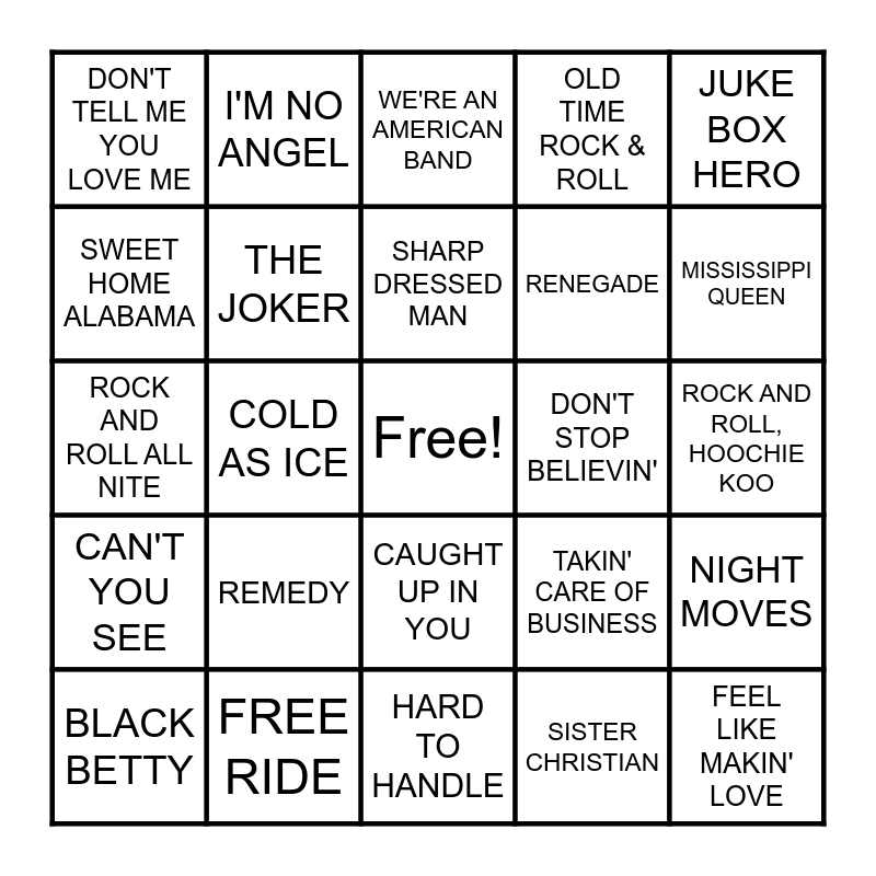 This bingo card has a free space and 46 words: SLOW RIDE, FEEL LIKE MAKIN' LOVE, ROCK AND ROLL FANTASY, HARD TO HANDLE, REMEDY, KEEP YOUR HANDS TO YOURSELF, I'M NO ANGEL, GIMME THREE STEPS, SWEET HOME ALABAMA, TAKE THE MONEY AND RUN, THE JOKER, OLD TIME ROCK & ROLL, NIGHT MOVES, TAKIN' CARE OF BUSINESS, YOU AIN'T SEEN NOTHING YET, LA GRANGE, SHARP DRESSED MAN, DON'T STOP BELIEVIN', ANY WAY YOU WANT IT, JUKE BOX HERO, COLD AS ICE, SISTER CHRISTIAN, DON'T TELL ME YOU LOVE ME, RENEGADE, COME SAIL AWAY, MISSISSIPPI QUEEN, BLACK BETTY, HOLD ON LOOSELY, CAUGHT UP IN YOU, CAN'T YOU SEE, PRIDE AND JOY, BAD TO THE BONE, MOVE IT ON OVER, SMOKE ON THE WATER, HIGHWAY STAR, FREE RIDE, ROCK AND ROLL, HOOCHIE KOO, THE STROKE, LONELY IS THE NIGHT, YOUR LOVE, JESSIE'S GIRL, WE'RE AN AMERICAN BAND, ROCK AND ROLL ALL NITE, BORN TO BE WILD, WE WILL ROCK YOU and ONCE BITTEN, TWICE SHY.