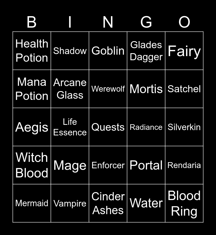 This bingo card has a free space and 24 words: Mage, Vampire, Werewolf, Mermaid, Fairy, Health Potion, Mana Potion, Shadow, Radiance, Enforcer, Mortis, Aegis, Portal, Rendaria, Arcane Glass, Water, Silverkin, Goblin, Satchel, Life Essence, Blood Ring, Witch Blood, Glades Dagger and Cinder Ashes.