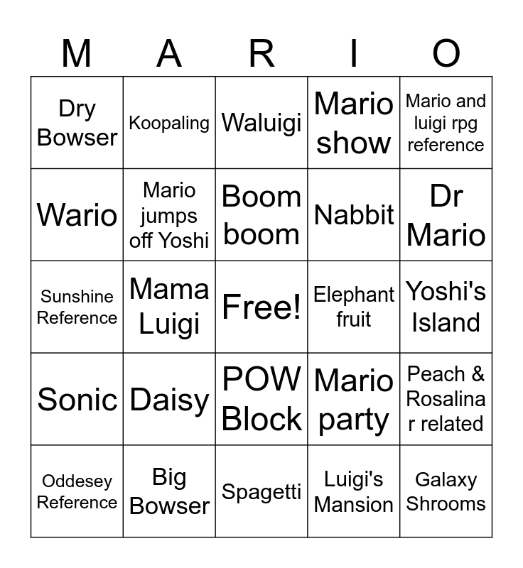 This bingo card has a free space and 24 words: Daisy, Big Bowser, Boom boom, Oddesey Reference, Mario and luigi rpg reference, Dry Bowser, Wario, Koopaling, Elephant fruit, POW Block, Nabbit, Sunshine Reference, Mario party, Peach & Rosalina r related, Mario jumps off Yoshi, Luigi's Mansion, Yoshi's Island, Waluigi, Dr Mario, Mama Luigi, Galaxy Shrooms, Sonic, Mario show and Spagetti.