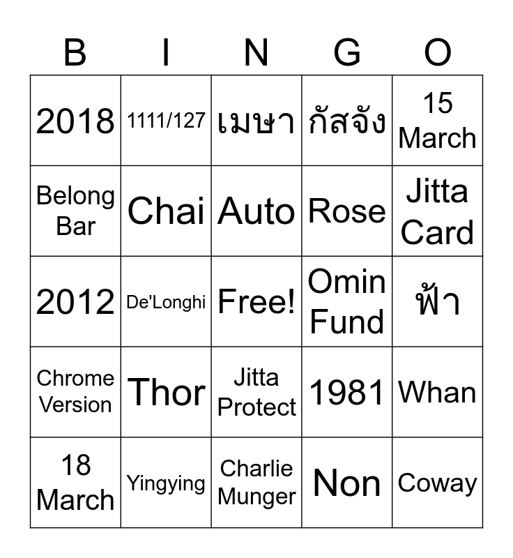 This bingo card has a free space and 24 words: Thor, Yingying, Auto, 18 March, 15 March, 2018, Belong Bar, 1111/127, Omin Fund, Jitta Protect, Rose, 2012, 1981, Whan, Chai, Non, ฟ้า, เมษา, Jitta Card, De'Longhi, Coway, Chrome Version, กัสจัง and Charlie Munger.