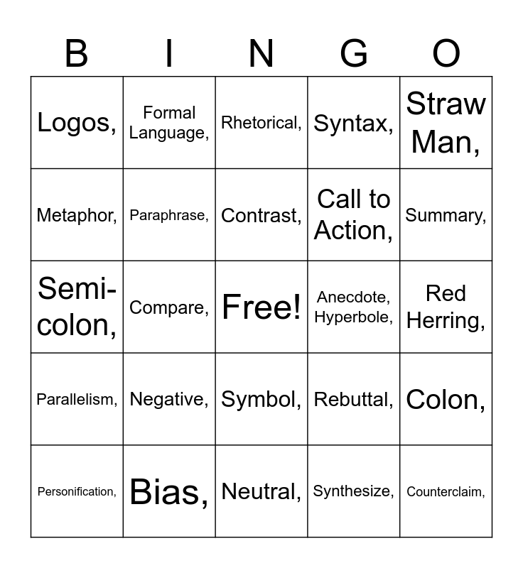 This bingo card has a free space and 54 words: Ethos,, Parallelism,, Situational Irony,, Allusion,, Symbol,, Pathos,, Syntax,, Verbal Irony,, Metaphor,, False Dilemma,, Logos,, Transition,, Bias,, Personification,, Hasty Generalization,, Neutral,, Counterclaim,, Call to Action,, Imagery,, Red Herring,, Rebuttal,, Informal Language,, Anecdote, Hyperbole,, Straw Man,, Repetition,, Formal Language,, Analogy,, Rhetorical Question,, Ad Hominem,, Synthesize,, Evaluate,, Inquiry,, Purpose,, Social Commentary,, Rhetorical,, Hyphen,, Semi-colon,, Colon,, Point of View,, Paraphrase,, Implications,, Primary Source,, Secondary Source,, Positive,, Negative,, Denotation,, Connotation,, Diction,, Contrast,, Compare,, Summary,, Slippery Slope,, Either/or and Theme..