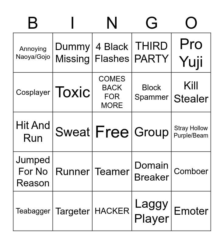 This bingo card has a free space and 24 words: Runner, Targeter, COMES BACK FOR MORE, Teabagger, Pro Yuji, Annoying Naoya/Gojo, Cosplayer, Dummy Missing, Group, Teamer, Block Spammer, Hit And Run, Domain Breaker, Comboer, Toxic, Laggy Player, Stray Hollow Purple/Beam, 4 Black Flashes, Kill Stealer, Sweat, Emoter, Jumped For No Reason, THIRD PARTY and HACKER.