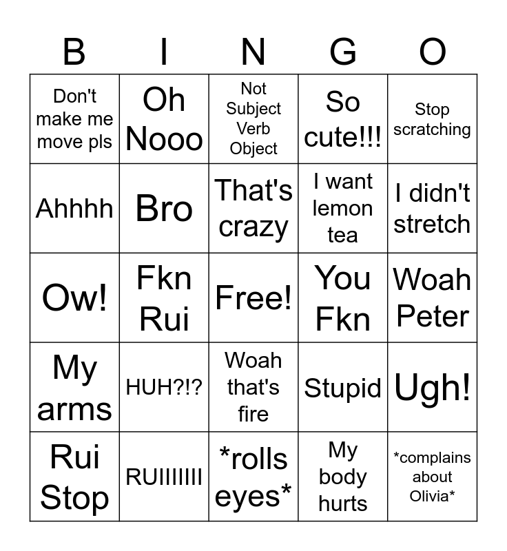 This bingo card has a free space and 24 words: HUH?!?, RUIIIIIII, That's crazy, Rui Stop, Stop scratching, Don't make me move pls, Ahhhh, Oh Nooo, You Fkn, Woah that's fire, I want lemon tea, Ow!, Stupid, Ugh!, Bro, My body hurts, Woah Peter, Not Subject Verb Object, I didn't stretch, Fkn Rui, *complains about Olivia*, My arms, So cute!!! and *rolls eyes*.