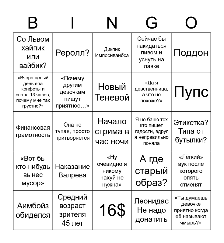 This bingo card has a free space and 24 words: Аимбойз обиделся, Наказание Валрева, Новый Теневой, Леонидас Не надо донатить, Поддон, Со Львом хайпик или вайбик?, Реролл?, Дикпик Импосивайбса, Я не баню тех кто пишет гадости, вдруг я неправильно поняла, Этикетка? Типа от бутылки?, Финансовая грамотность, «Почему другим девочкам пишут приятное…», А где старый образ?, «Лёгкий» аук после которого опять отменят, «Вчера целый день ела конфеты и спала 13 часов, почему мне так грустно?», Средний возраст зрителя 45 лет, 16$, Сейчас бы накидаться пивом и уснуть на лавке, Пупс, «Вот бы кто-нибудь вынес мусор», Она не тупая, просто притворяется, «Ну очевидно я никому нахуй не нужна», «Да я девственница, а что не похоже?» and «Ты думаешь девочке приятно когда её называют чмырь?».