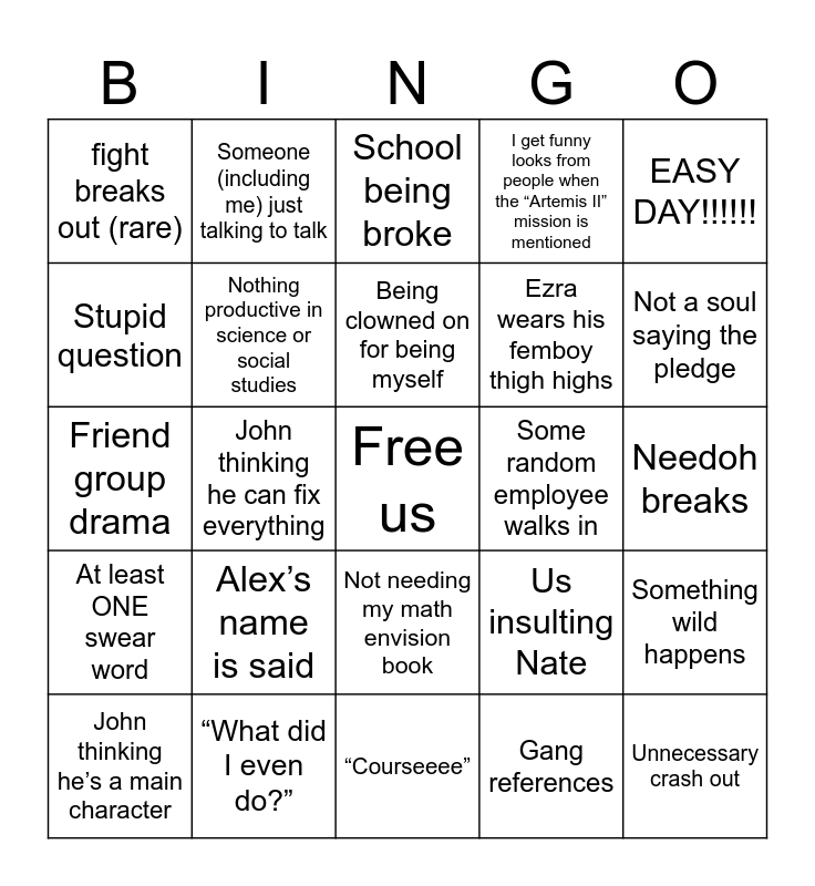 This bingo card has a free space and 24 words: Alex’s name is said, “What did I even do?”, Being clowned on for being myself, John thinking he’s a main character, EASY DAY!!!!!!, fight breaks out (rare), Stupid question, Someone (including me) just talking to talk, Some random employee walks in, Not needing my math envision book, Ezra wears his femboy thigh highs, Friend group drama, Us insulting Nate, Something wild happens, Nothing productive in science or social studies, Gang references, Needoh breaks, School being broke, Not a soul saying the pledge, John thinking he can fix everything, Unnecessary crash out, At least ONE swear word, I get funny looks from people when the “Artemis II” mission is mentioned and “Courseeee”.